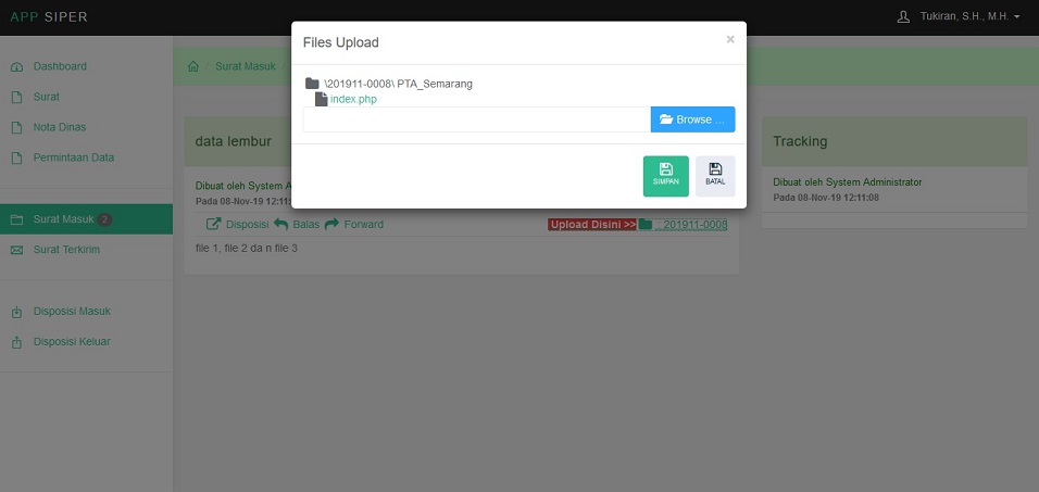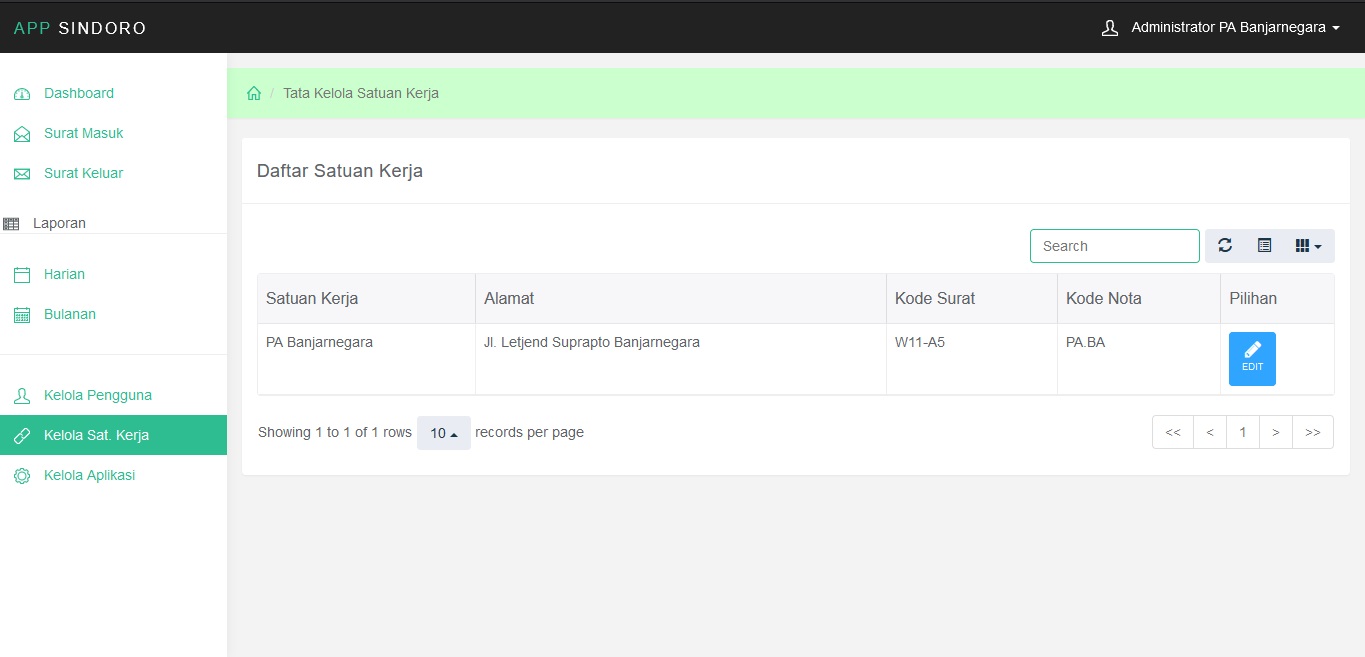 Untuk pengguna ini mempunyai akses penuh ke seluruh menu, namun dibatasi oleh Satuan Kerja, khususnya dalam pengelolaan pengguna, menghapus surat, dan edit surat.